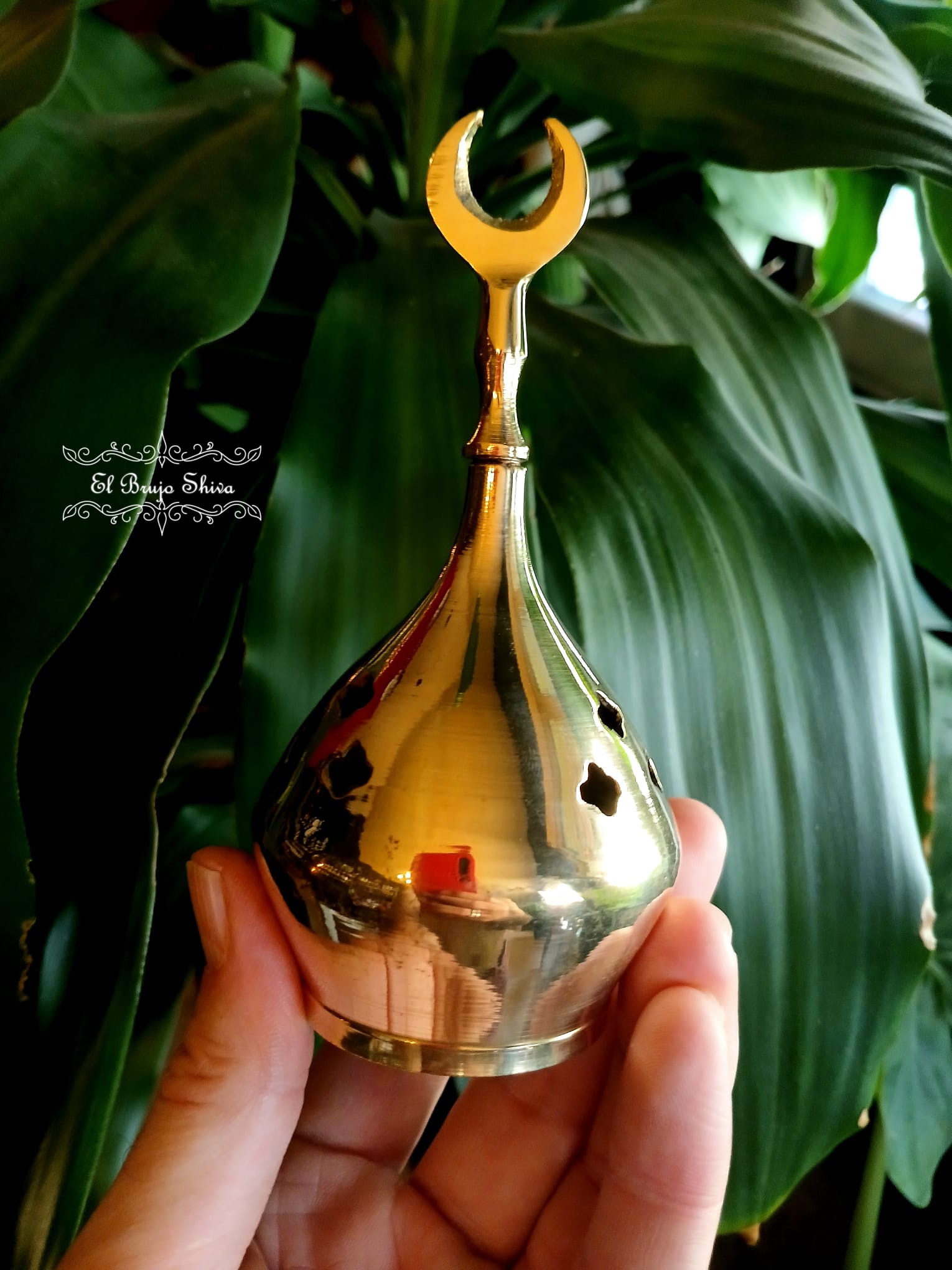 Magnífico Incensario metálico con cabujón terminado en forma de luna. Este incensario metálico es de color dorado y está diseñado para quemar incienso en grano. Es de metal para aguantar las altas temperaturas del carbón. En el interior se pone el carbón con el incienso en grano, y se deja que el humo salga por sus agujeros, perfumando el ambiente. Su estructura es oriental y está compuesta de dos piezas (base y tapa con agujeros).