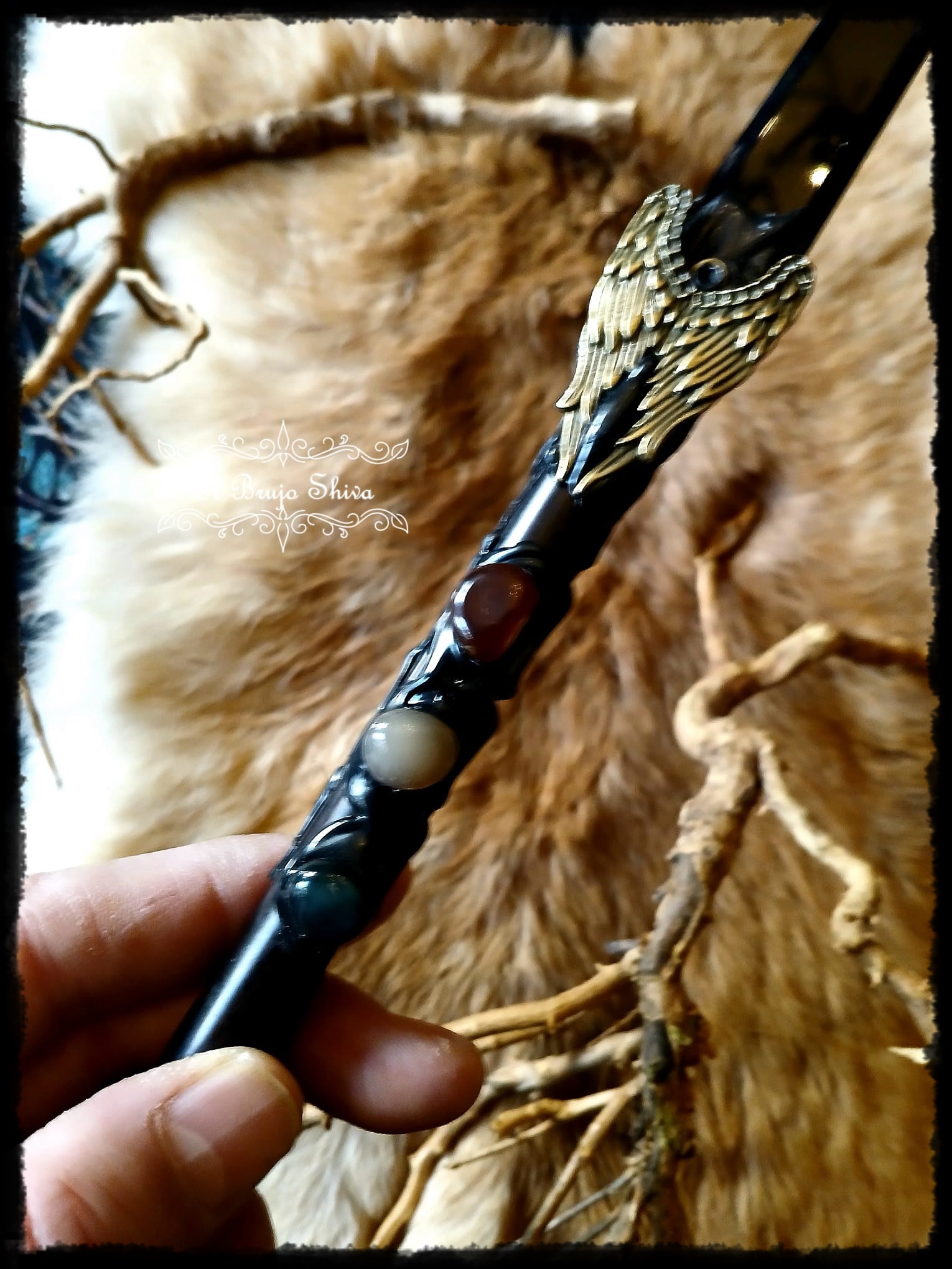 La vara es un instrumento de poder. Simboliza la voluntad, la energía, la intención y la fuerza interna que nos ayuda a expresar lo que deseamos. En la magia representa el poder del fuego y el aire. Con ella se realizan rituales, símbolos, trazados de círculos mágicos y rituales energéticos. También sirve para proyección energética o astral y realizar trabajos avanzados.
